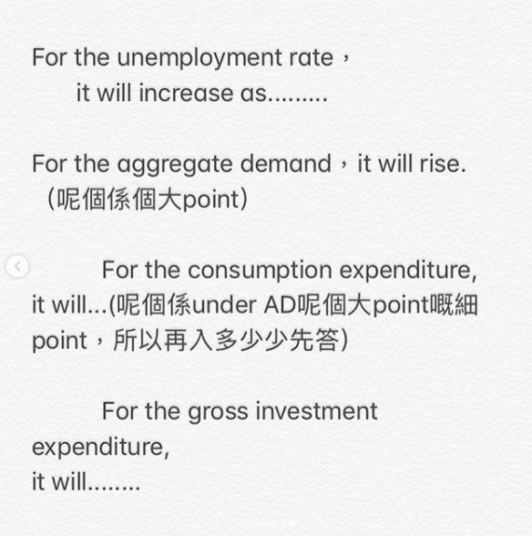 而有時候(好似今年咁),佢會叫你講埋「other economic variables」,咁究竟咩係economic variables呢?其實大部分學過嘅野都係,eg BOP, GDP, employment rate, price level, aggregate output, money supply, interest rate, fiscal balance, tax revenue, inflation rate etc ,總之就係一d measure得到嘅野。咁我就建議你可以整定一個list,list out曬所有econ variable,咁到時就唔會諗唔到points