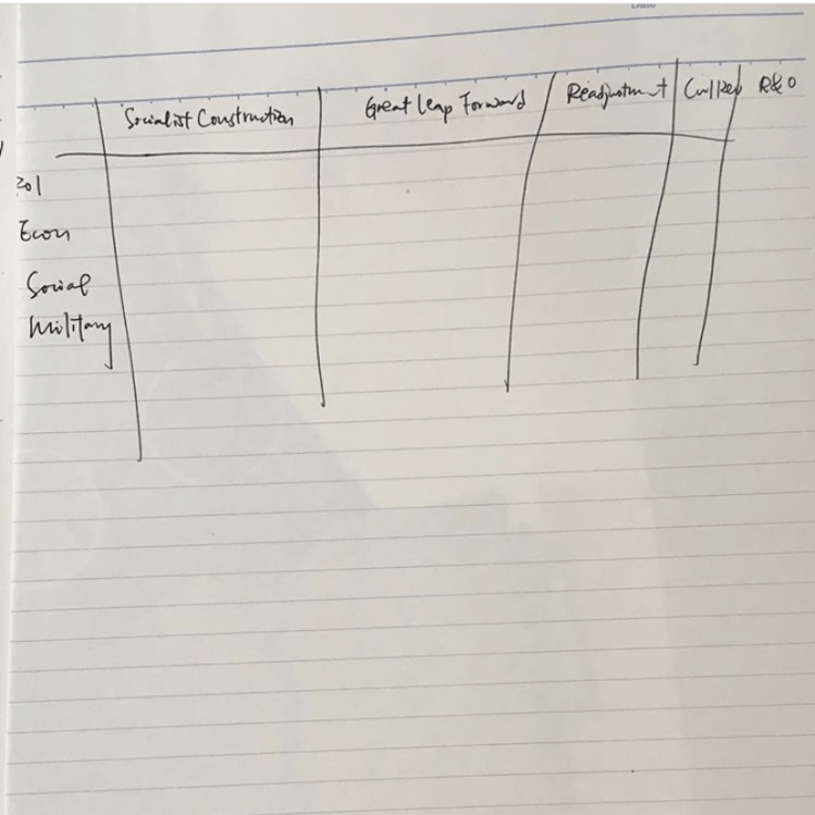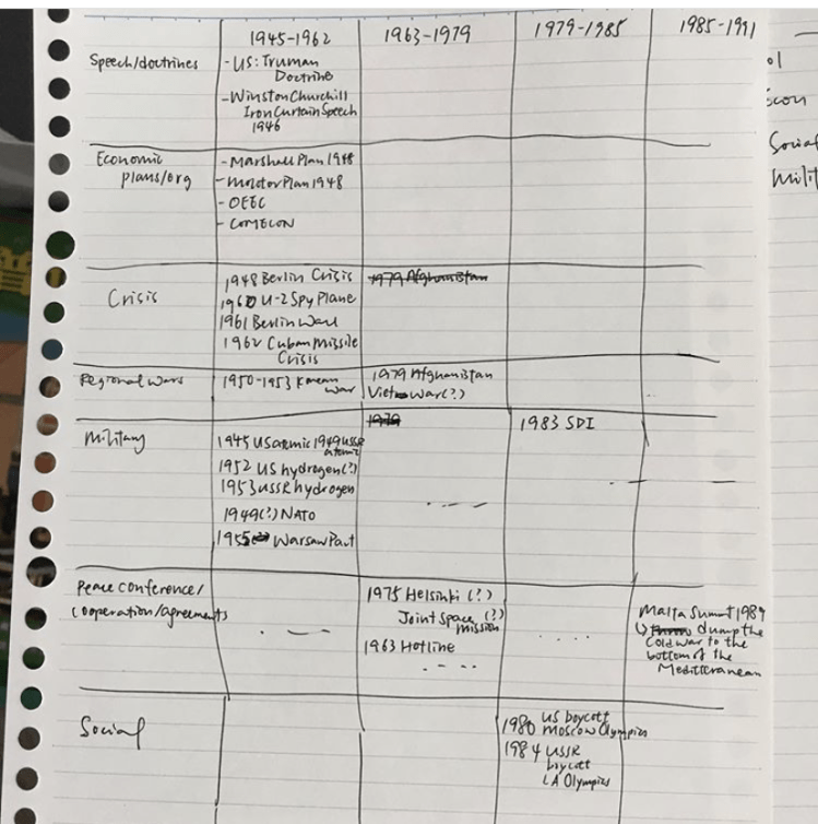 for補kw嘅人,kw已經幫你做左呢樣野啦,可以參考番每一課一個圖表KO一個課題嘅表。冇補kw嘅話你可以自己做,例如你將Cold War唔同論據分類分時期list出黎(參考下面嘅圖,示範only,只係擺左好少論據,你地自己擺返曬所有野落去),又或者將中國唔同時期嘅政策同情況分類歸納出黎(參考下面嘅圖),咁樣會易d溫習、易d記