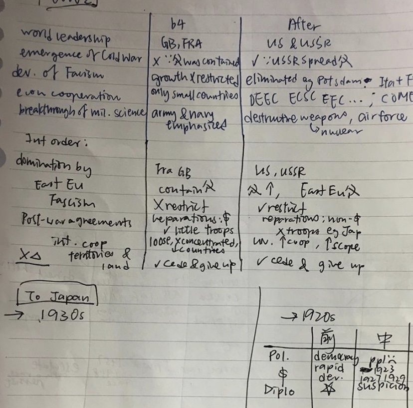 臨考dse之前,我會攞張紙專係做比較,例如比較毛vs鄧嘅政策/兩個時期嘅國家情況,比較ww2前後嘅國際局勢,比較1949前後嘅情況etc,除左幫到你做關於turning point/comparison嘅題目之外,都可以令你summarise同埋consolidate返你每個topic嘅學習內容&知識