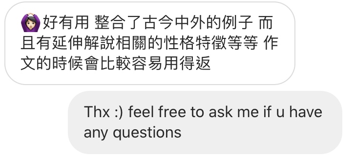 中文議論文裡面,例子係非常之重要嘅。我果陣大部分嘅例子都係來自我本身嘅已有知識(我對中史好有興趣),但係我都知道好多同學其實本身未必識太多例子。所以當收到好多同學問點樣搵d例子嘅時候,我就諗:既然我中文、中史、History都5**,咁不如用我嘅中史同歷史知識整一本百搭例子集啦,咁就可以方便到d同學啦,於是呢本萬用神例集就誕生左lu🤩